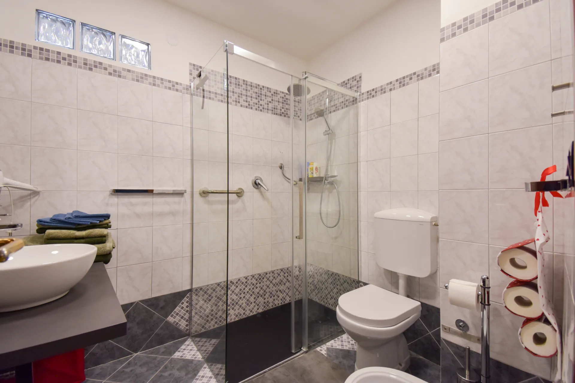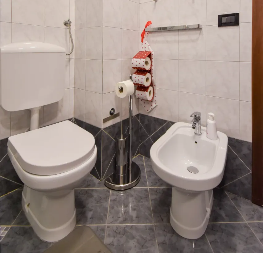 Bagno moderno con box doccia in cristallo (120x70 cm), wc, bidet, asciugamani, phon e docciaschiuma a disposizione.